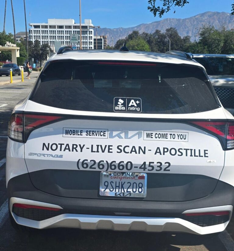 Mobile Notary Public will come to you in Los Angeles, Orange County or even San Bernardino County if needed. Call for travel fees.